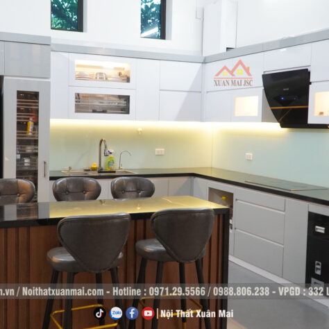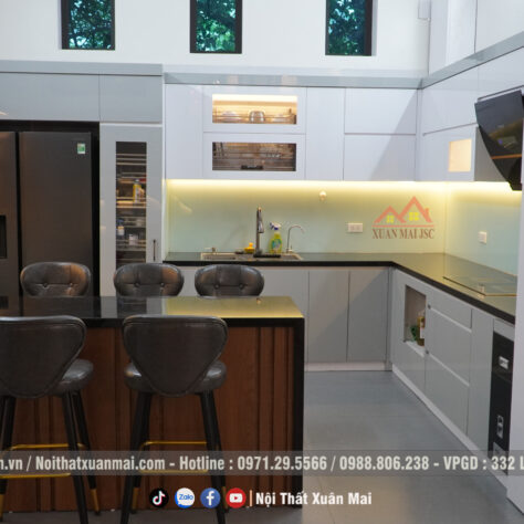 Phần tủ bếp trên sử dụng màu trắng, tủ bếp dưới sử dụng màu trắng xám hiện đại, trẻ trung, sang trọng cho căn bếp.