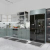 Tủ bếp dưới toàn bộ thùng tủ làm bằng chất liệu inox 304, hệ khung hộp liên kết gập chấn với hệ vách , không sơn tĩnh điện, cánh chất liệu mdf lõi xanh chống ẩm phủ Acrylic bóng gương