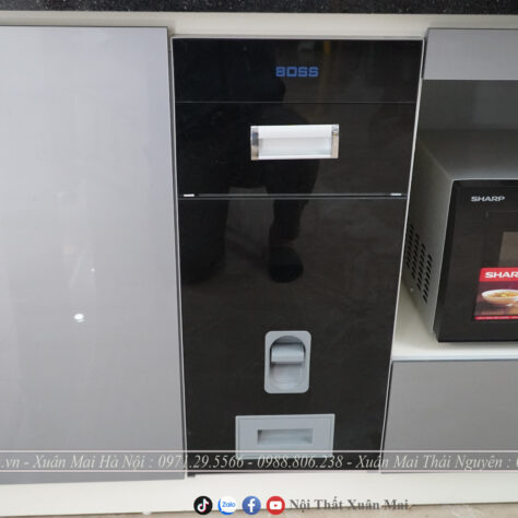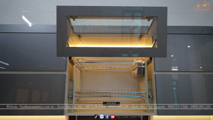 Tủ bếp trên Thùng tủ chất liệu nhựa PVC hãng Picomat, cánh MDF lõi xanh phủ Acrylic bóng gương, hậu là tấm Aluminium chống ẩm tuyệt đối dày 3 ly.