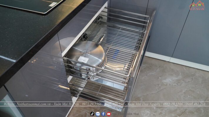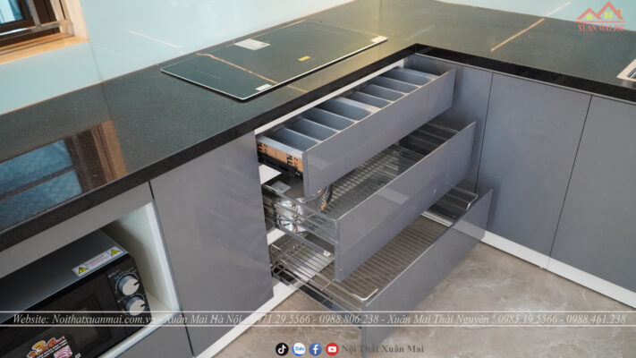 Tủ bếp dưới Thùng tủ chất liệu nhựa PVC hãng Picomat, cánh MDF lõi xanh phủ Acrylic bóng gương, hậu là tấm Aluminium chống ẩm tuyệt đối dày 3 ly.